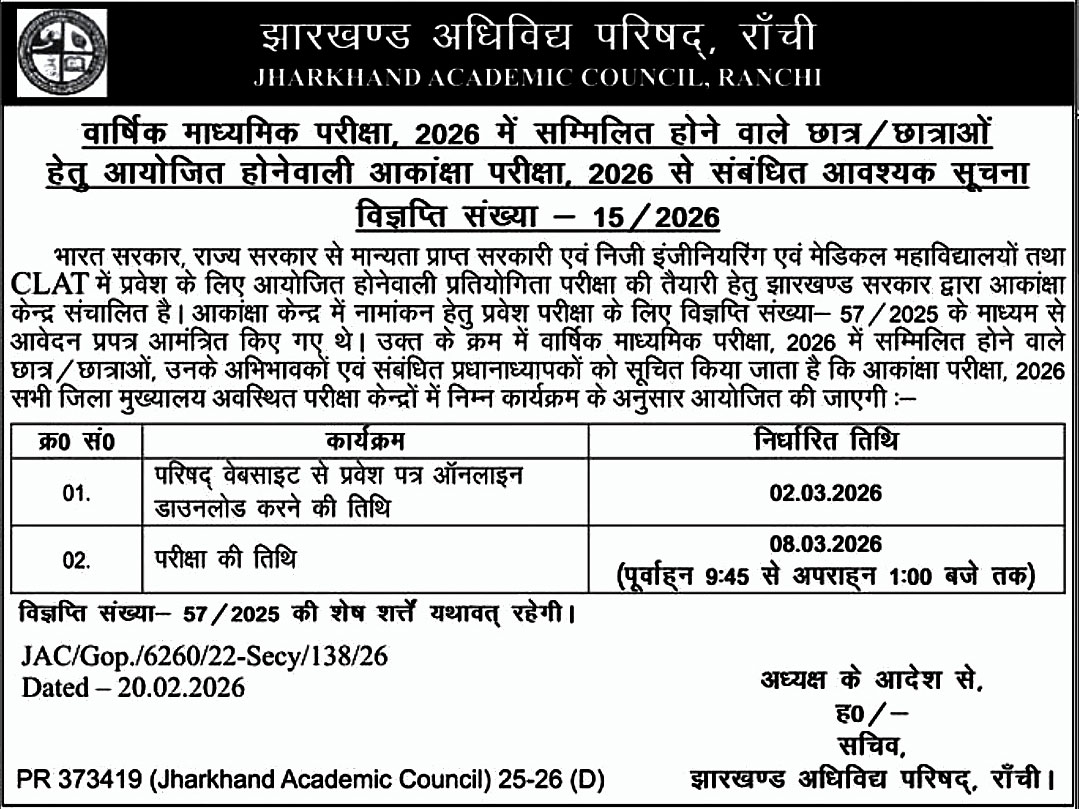 JAC Akanksha Exam Date 2026 has been officially released by the Jharkhand Academic Council (JAC). Students who are preparing for the Akanksha Entrance Examination 2026 can now download the official exam routine in PDF format from the authorised portal.