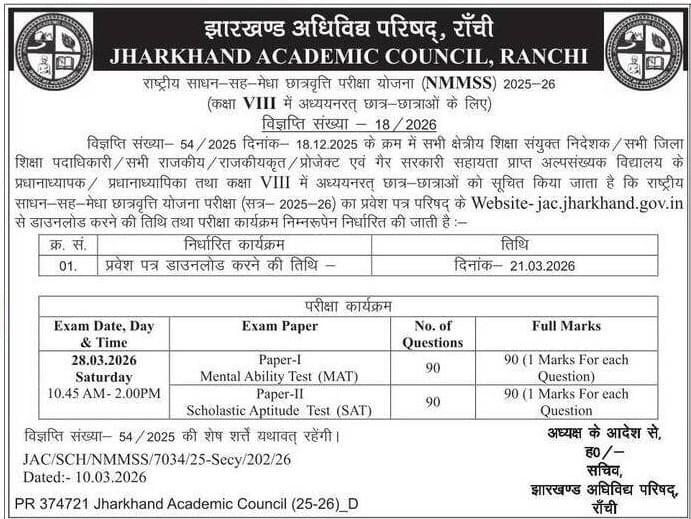 Jharkhand Academic Council (JAC) has officially released the Jharkhand NMMS Admit Card 2026 on 21 March 2026. Students who have registered for the National Means-cum-Merit Scholarship (NMMS) Examination 2026 can now download their hall ticket from the official portal.